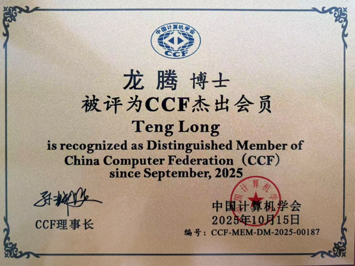 近日,中国计算机学会(CCF)发来祝贺信,我院龙腾博士在2025年度会员评选中当选为中国计算机学会(CCF)杰出会员(Distinguished Member)。