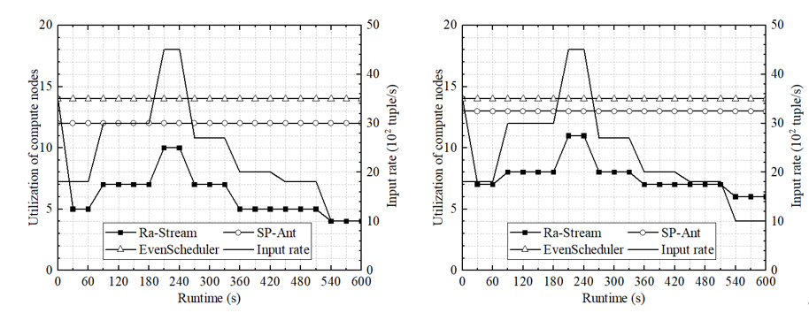 图3 波动数据流下WordCount(左)和DEBS 2024(右)计算节点使用数量