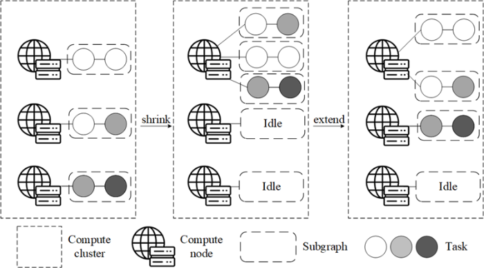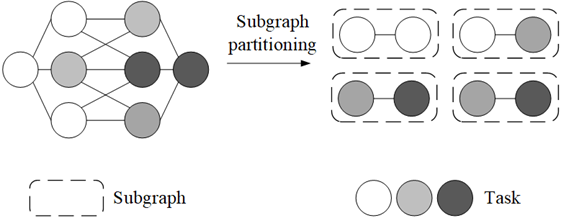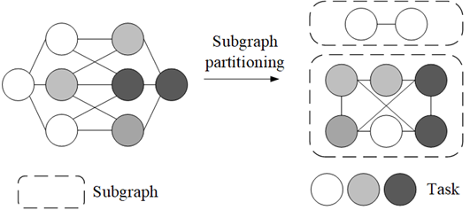 (2) 子图划分与资源伸缩:利用通信密集且均衡的子图划分方法,在最小化流应用程序的通信权重的同时有效避免子图间规模失衡。通过资源自动伸缩方法,并结合欠载-过载双阈值机制微观调整子图划分方案,在高度适配波动数据流同时实现资源负载均衡和高资源能效。