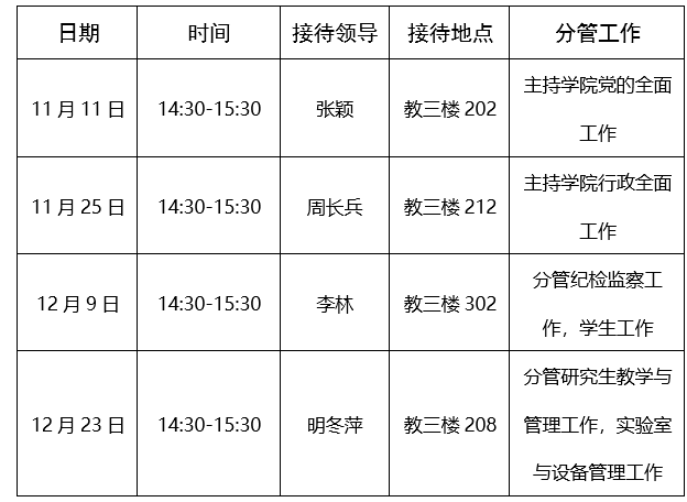 为进一步提高学院民主管理水平,及时了解和解决全院师生“急难愁盼”问题,广泛听取师生们的意见建议,学院开展院领导接待日,十一、十二月安排如下: