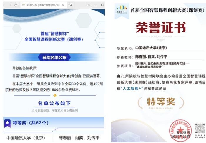 11月21日,首届“智慧树杯”全国智慧课程创新大赛(课创赛)获奖名单正式公示,我院计算机基础教学团队教师陈春丽、肖奕、刘传平申报的《计算机语言程序设计》智慧课程,荣获大赛特等奖。