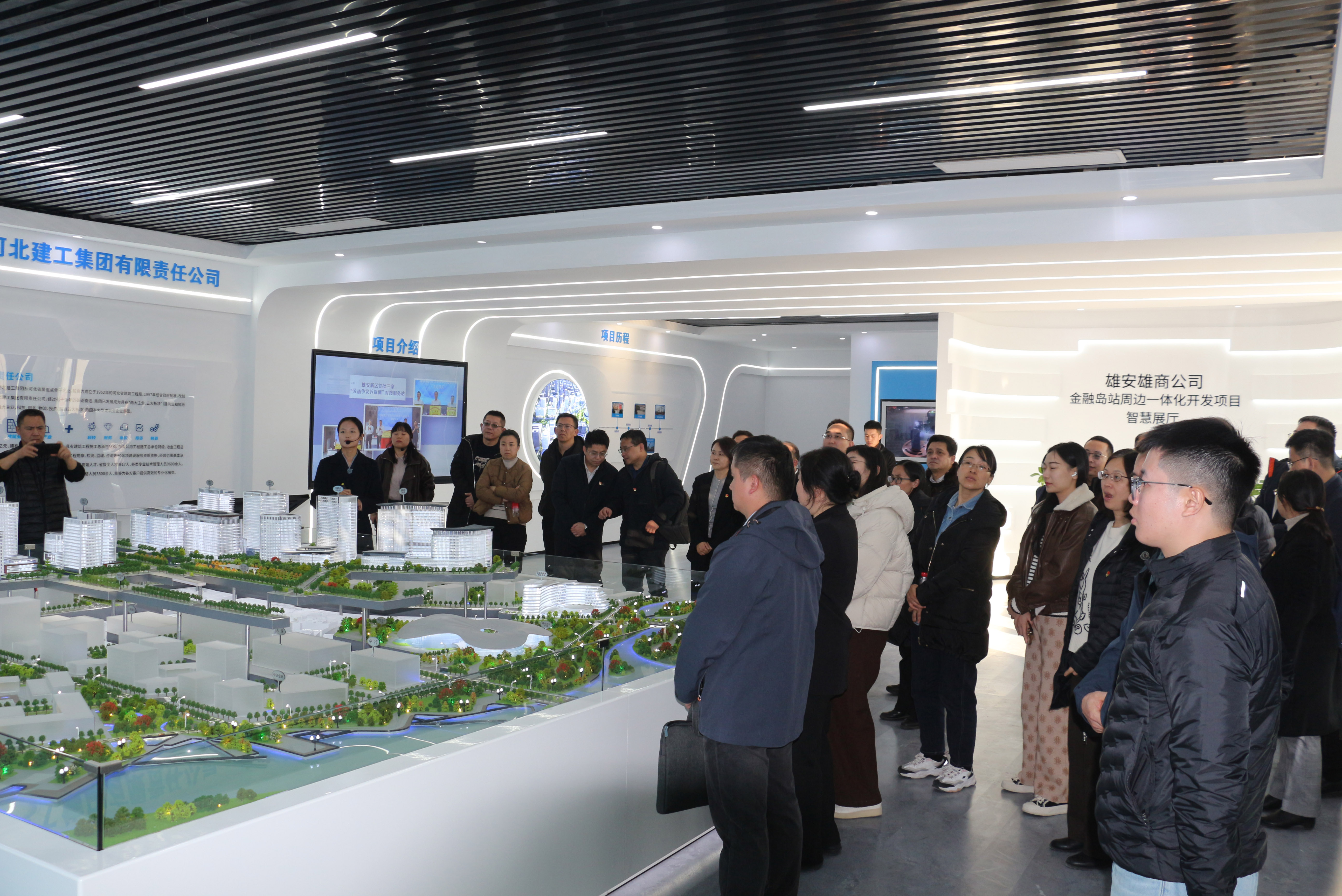 活动期间,与会人员参观了学校雄安校区建设现场、雄安新区四校协同展厅及金融岛站一体化开发项目,深入了解了我校雄安校区建设进展、其他三所疏解高校的规划建设情况及BIM伴随设计与全过程管理模式的创新实践。在武雄与刘欣的带领下,双方还参观了雄安国贸中心项目IROOM,听取了关于BIM总控管理与项目管理创新模式的系统介绍。