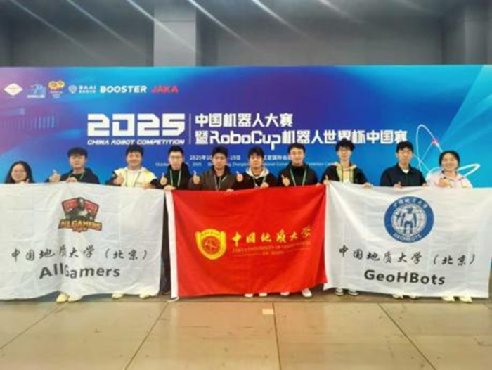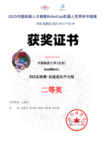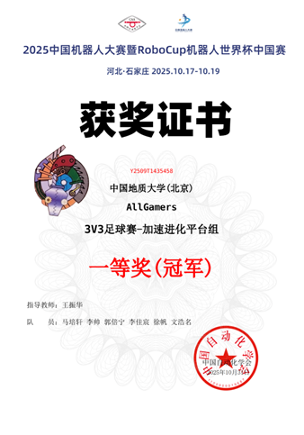 10月17—19日,2025年中国机器人大赛暨RoboCup机器人世界杯中国赛在石家庄国际会展中心举行。全国300余所高校、近1700支队伍、5000余名选手汇聚一堂。本届赛事首次设立标准平台赛项“3V3AI足球赛·加速进化平台组”,采用瑞士轮三轮全打、统一硬件平台与开源示例,聚焦算法对抗与多机协同的深度二次开发,我校组织两队共11名队员参加该项赛项。在该赛项中,我校信息技术创新实验基地孵化的两支队伍发挥稳健:AllGamers战队以3胜0负夺得冠军,GeoHBots战队2胜1负获得第四名。