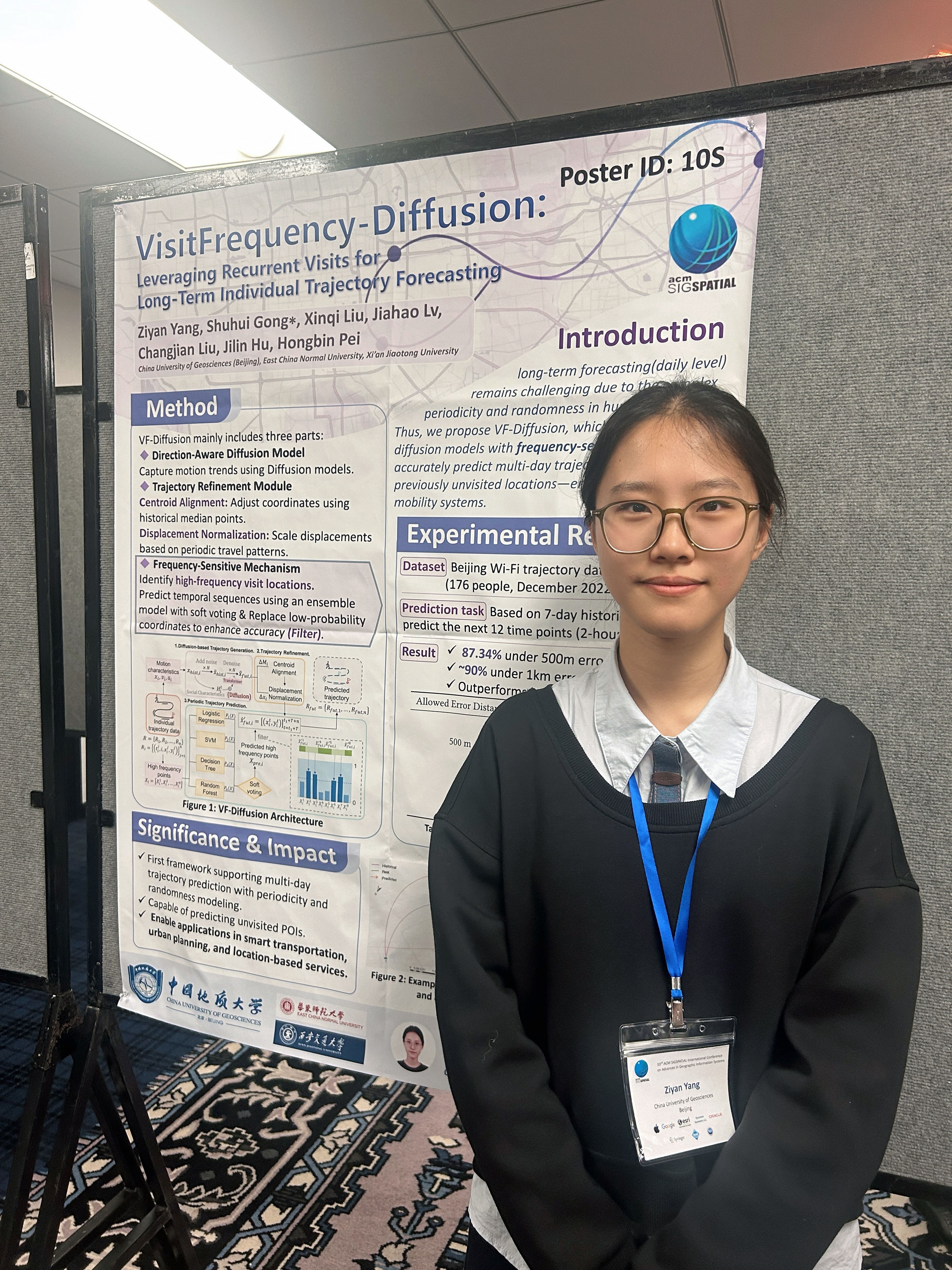 近日,第33届国际地理信息系统大会(ACM SIGSPATIAL 2025)在美国明尼苏达州明尼阿波利斯举行。我院副教授公书慧课题组的2023级本科生杨梓燕作为第一作者的研究论文《VisitFrequency-Diffusion: Leveraging Recurrent Visits for Long-Term Individual Trajectory Forecasting》被大会接收,并受邀作学术报告。