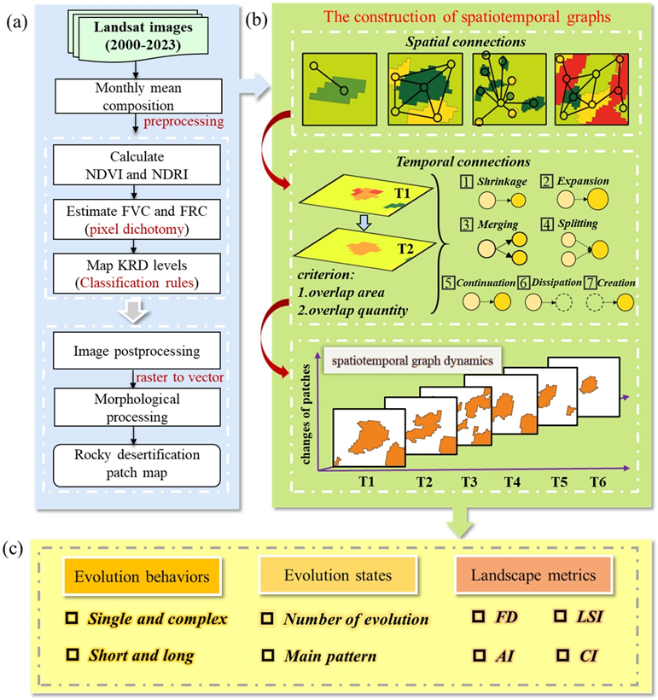 图1 基于图论的石漠化时空演变检测框架,(a)基于长时序Landsat数据生成的石漠化等级图,(b)基于时空关联关系构建的石漠化时空图,(c)石漠化时空演变特征指标