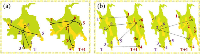 (1)创新时空图构建方法,突破传统分析局限:引入图论思想,将石漠化等级斑块定义为“节点”,将斑块间的空间邻接关系与时间重叠关系定义为“边”,成功构建石漠化斑块的时空图结构。该结构实现了对石漠化斑块连续时空关联关系的“显式表达”,有效解决了传统多时相对比方法难以刻画斑块演化连续性的技术瓶颈,为后续精细化分析奠定基础(图2)。