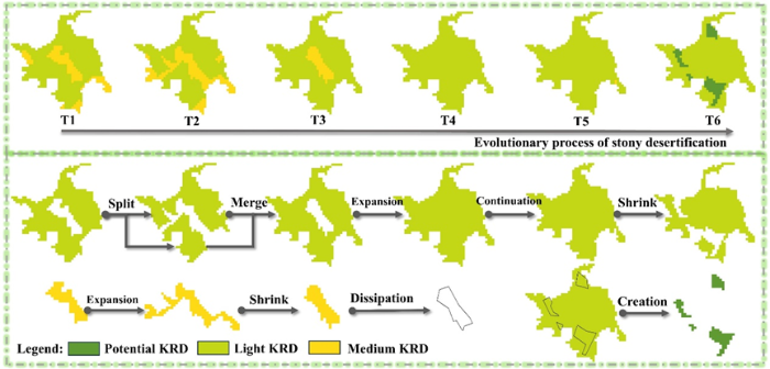 (2)系统识别演化行为,揭示多维演化规律:在时空图分析框架下,精准识别出石漠化斑块的七类基本演化行为,包括延续、扩张、收缩、合并、分裂、产生与消失。基于此,进一步刻画了不同石漠化等级在长时间序列中的主导演化方式,明确提出“石漠化演化并非单向线性变化,而是伴随频繁演化行为转化的复杂过程”这一关键结论,丰富了对石漠化动态演化的认知(图3)。