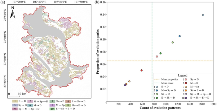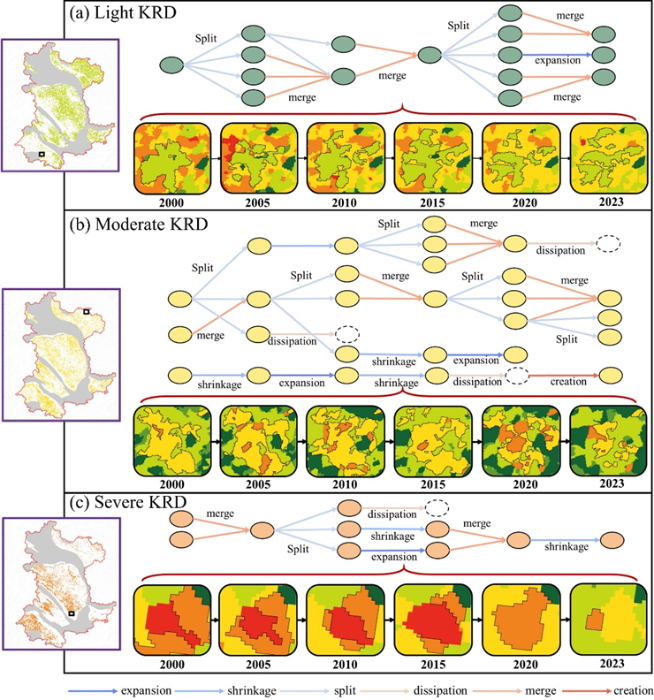 (4)识别典型状态模式,量化生态修复成效:在演化状态层面,提炼出“扩张→消失”、“合并→分裂→消失”和“收缩→消失”三类典型状态转变模式。其中,“扩张→消失”模式出现频率最高(约占总数的15%),且空间分布与生态修复强度较高区域高度吻合,证实了该区域石漠化治理的显著成效,为生态修复效果评估提供了可量化的指标(图5)。