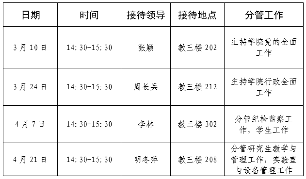 为进一步提高学院民主管理水平,及时了解和解决全院师生“急难愁盼”问题,广泛听取师生们的意见建议,学院开展院领导接待日,三、四月安排如下: